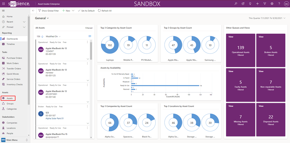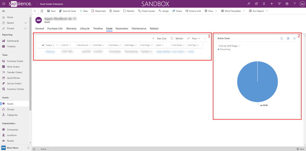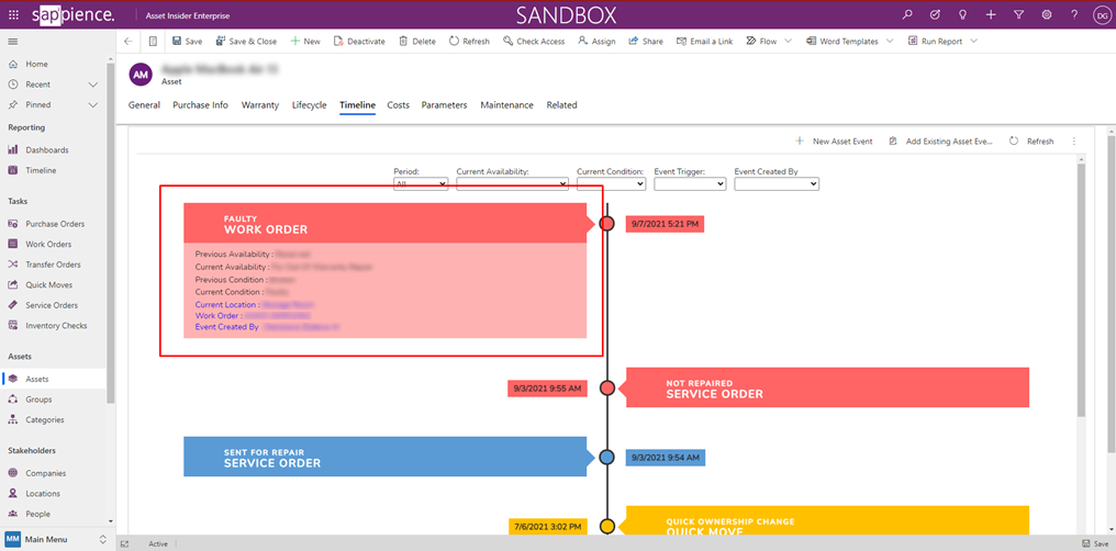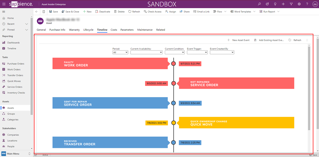 In this tab, there is a timeline representation with information about all events that happened to the asset from the day of purchase to its disposal
