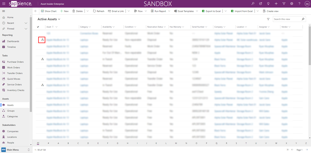 - If an asset has a related parent there will be a small hierarchy icon next to it.