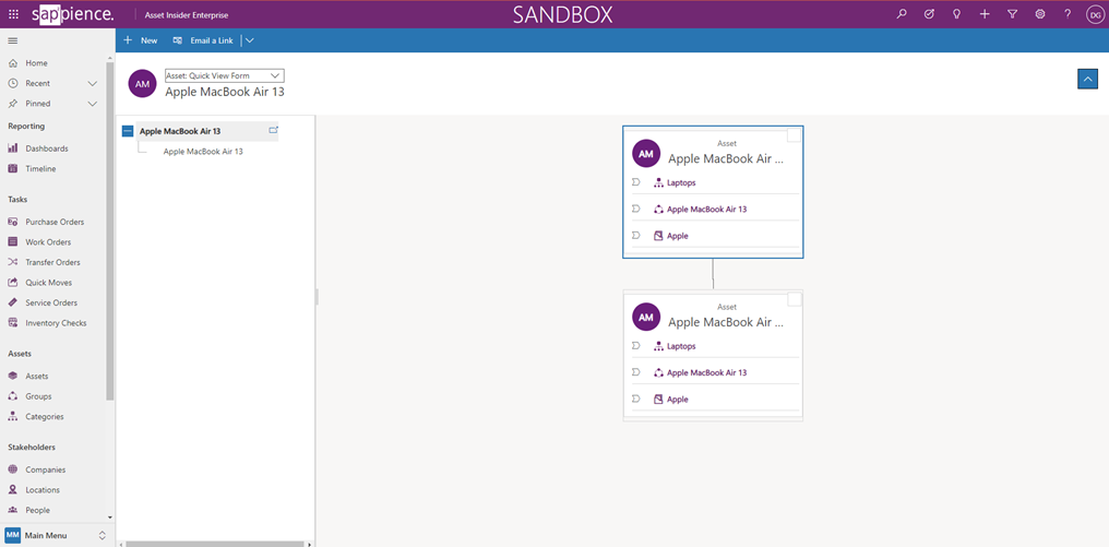 Each asset can have a related parent asset which is visible in the asset hierarchy view.