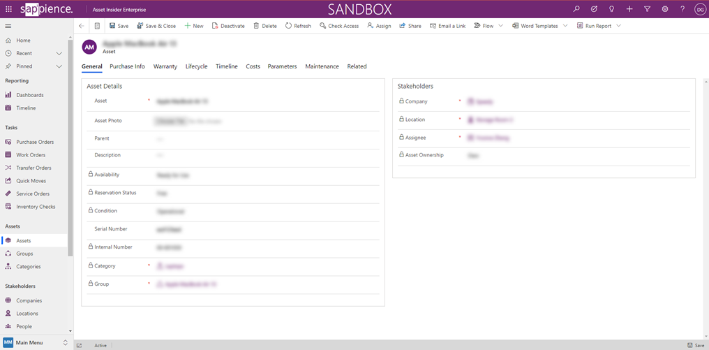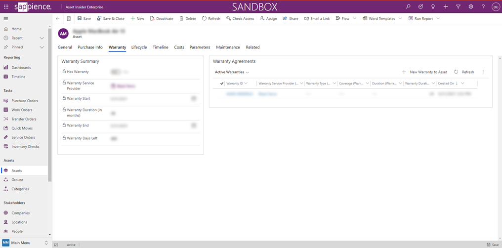 - Warranty Days Left - an auto-calculated field with information about how many days are left of the warranty based on the Active warranty agreement and/or warranty extensions