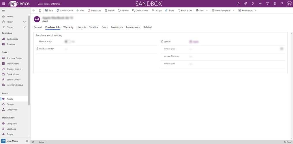 - If “Manual entry” is not switched to “Yes” the second field will be the link to the Purchase Order of the asset