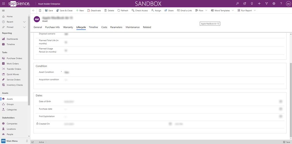 - Planned Disposal Date - planned disposal date (auto-calculated) based on the Planned Total Life field