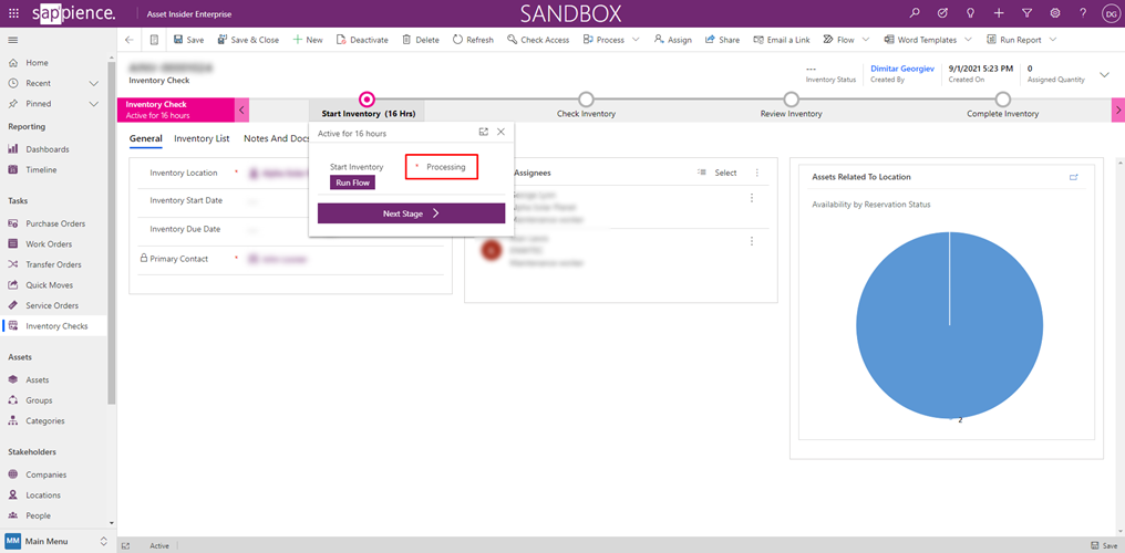7. The “Start Inventory” status will be set to “Processing” which means that your inventory list with the assets from the selected by you earlier location is preparing at the moment. It may take a while depending on how many assets there are in the chosen location.