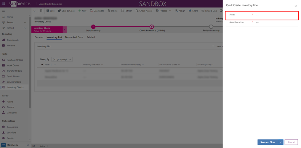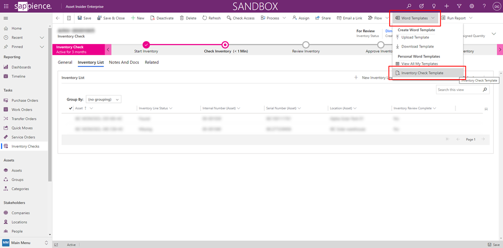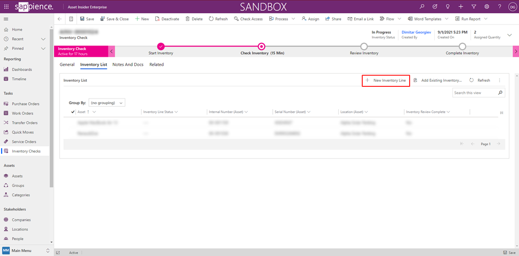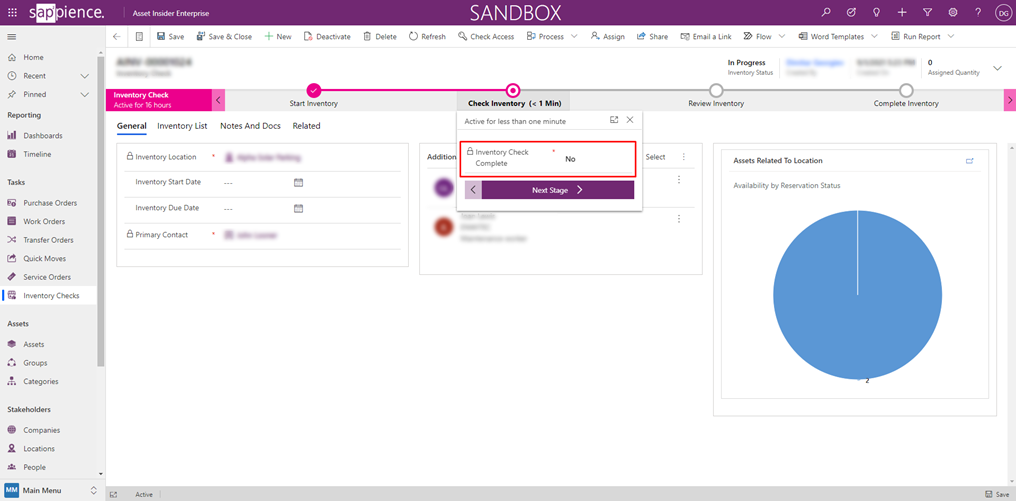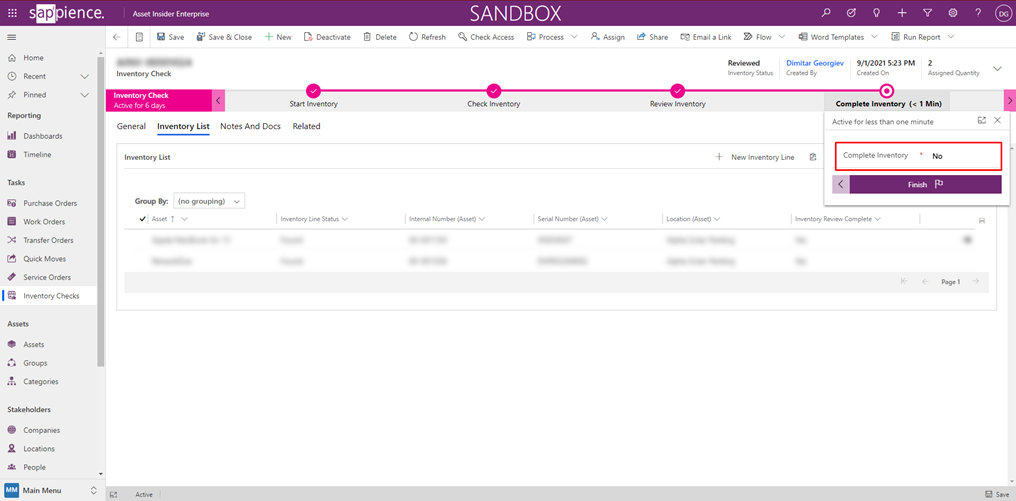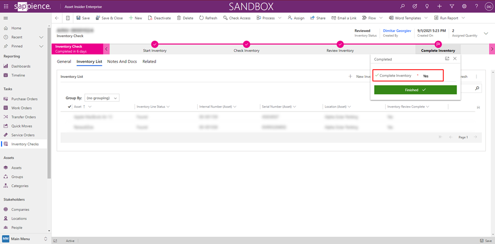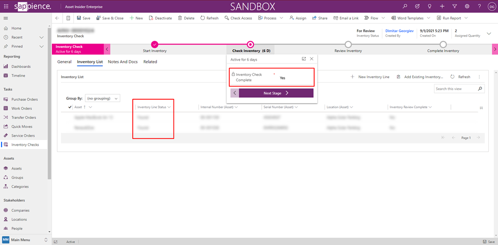 14. When all assets in the inventory list are checked the “Inventory Check Complete” field will change its value to “Yes”. Then you can move to the next stage.