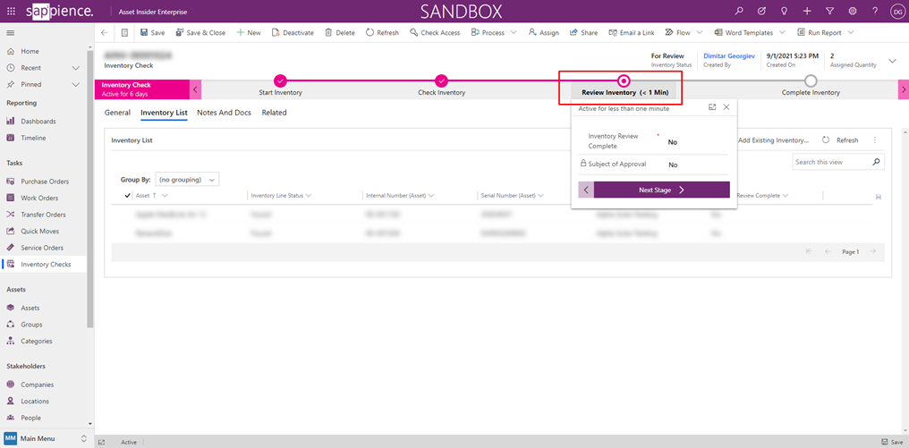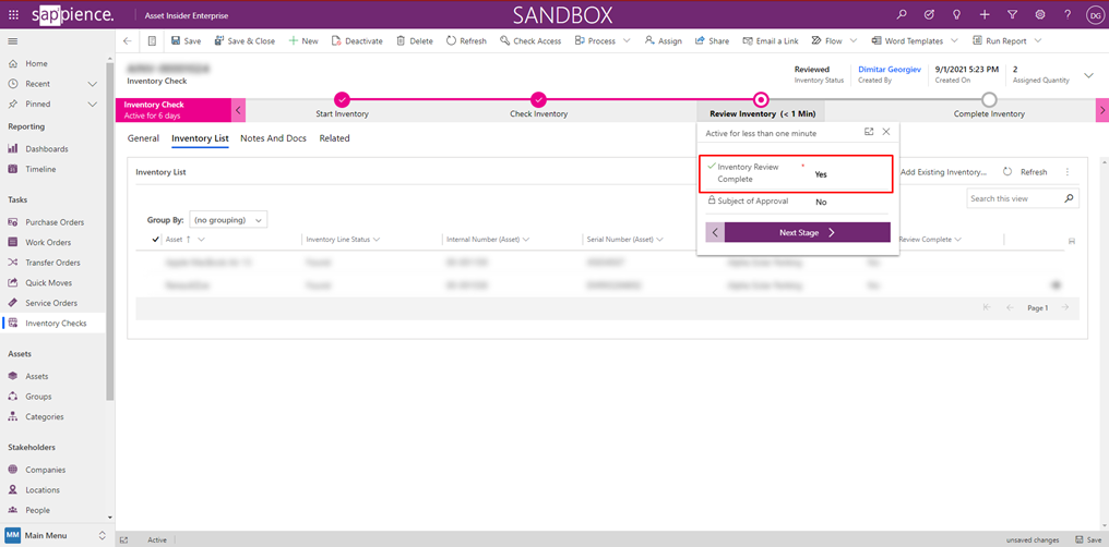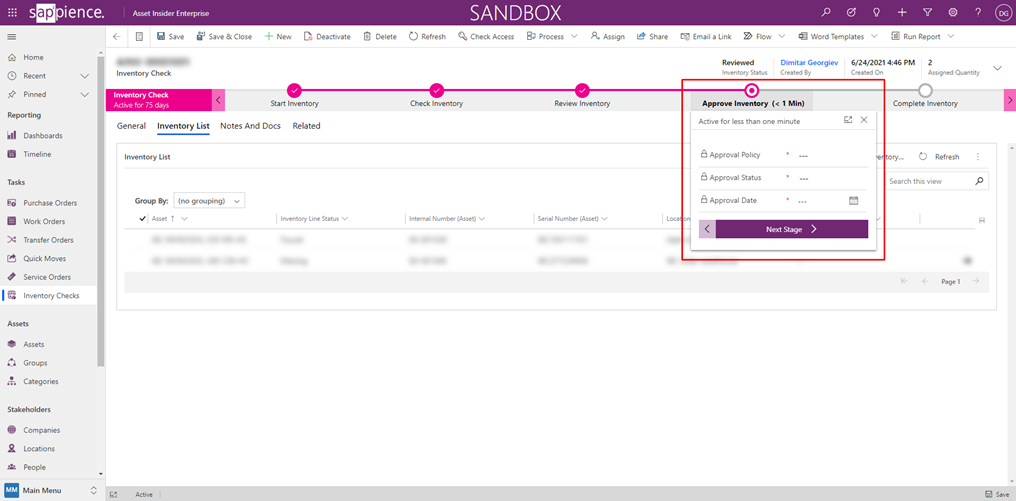 Note: If the inventory is approved by a responsible person that the needed information in the “Approve Inventory” stage will be auto-populated and you will be able to proceed to the next stage. If the inventory is rejected the inventory will be cancelled and the assets will be restored to their initial state.