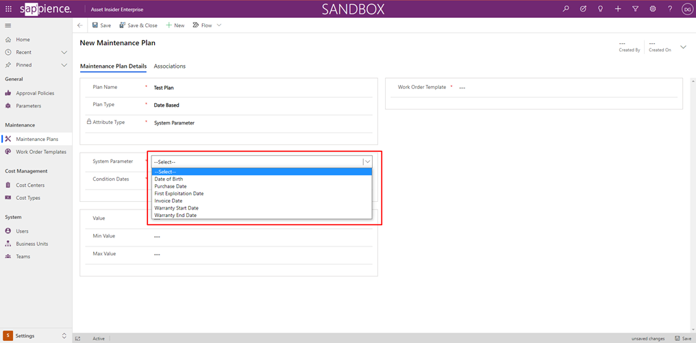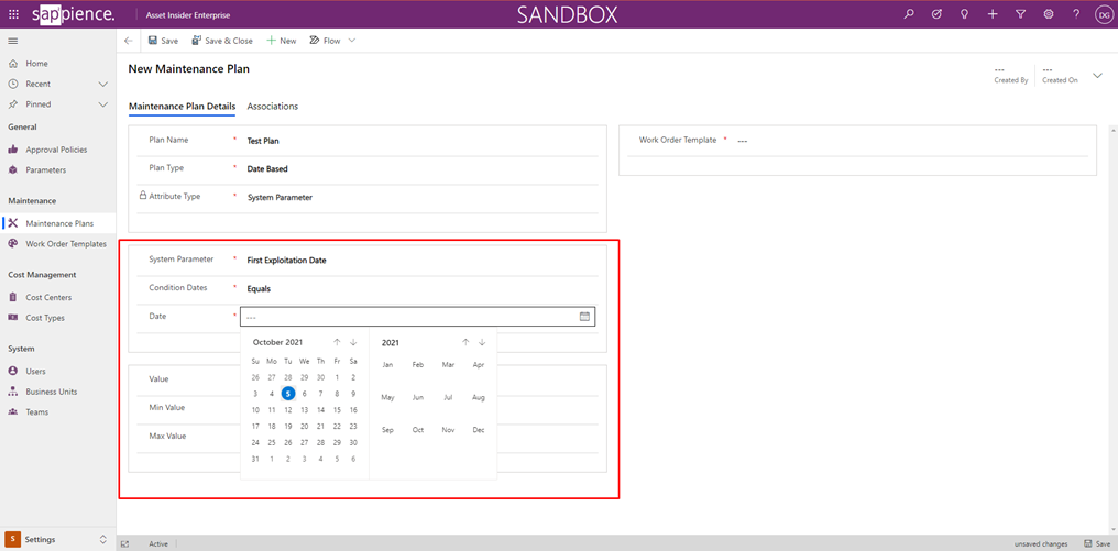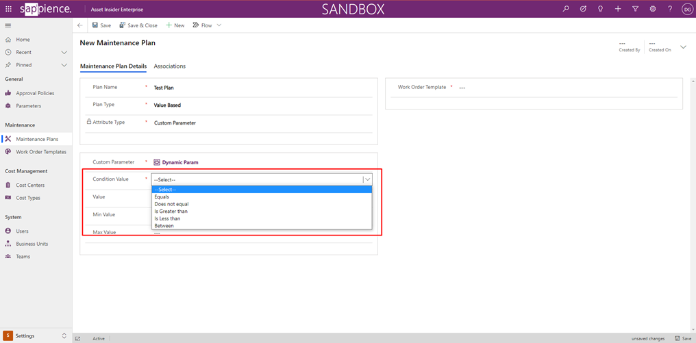 b. If you select “Value Based” type as an event to trigger the automatic Work Order creation: